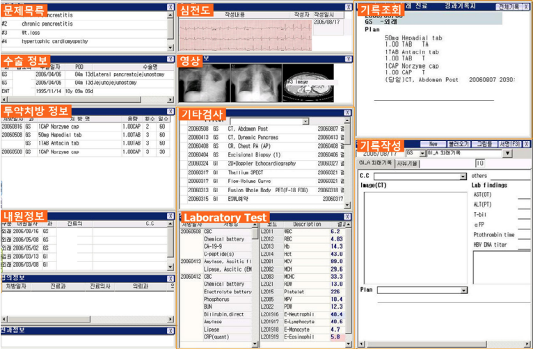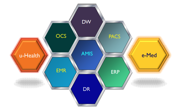 - 진료지원 시스템: 약품 관리 시스템, 임상병리(진단검사의학) 관리 시스템, 방사선(영상의학) 관리 시스템, 의무기록 관리 시스템, 급식 관리 시스템, 의료 소모품 관리 시스템, 수술실 관리 시스템