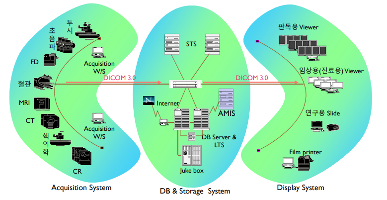 디지털 상태로 의료영상을 획득, 저장, 전송하고 의료진들이 컴퓨 터를 이용해 이를 조회, 검색, 판독할 수 있도록 지원하는 포괄적인 디지털 영상관리 및 전송시스템