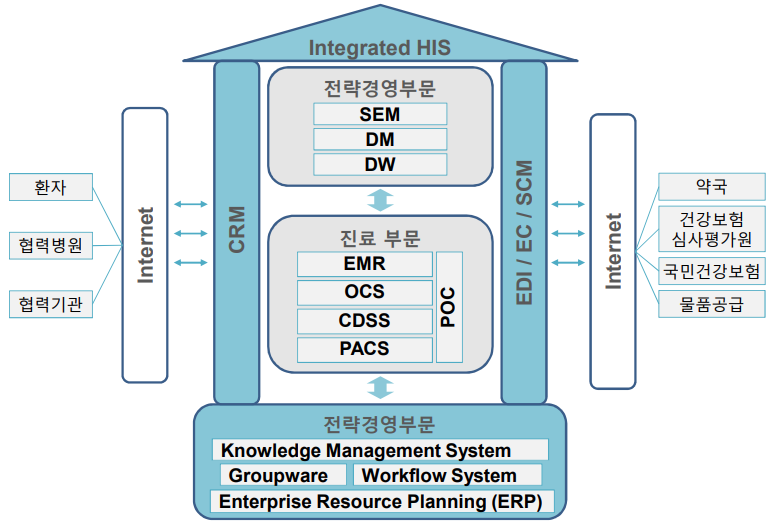 - 진료, 진료 지원, 원무/행정, 경영/관리 정보를 적절하게 제공하고 활용할 수 있도록 하는 하위시스템들로 구성