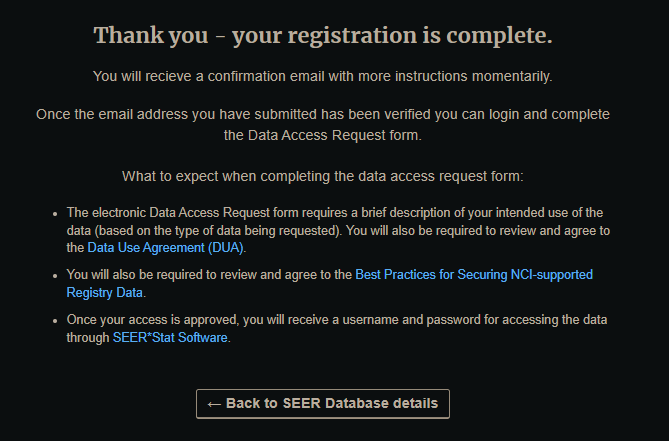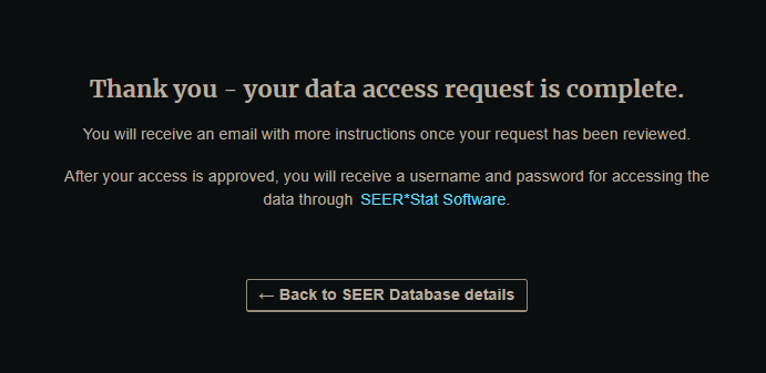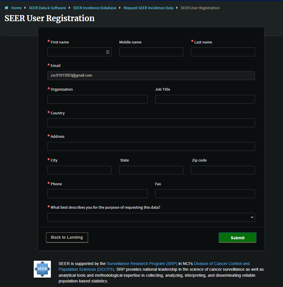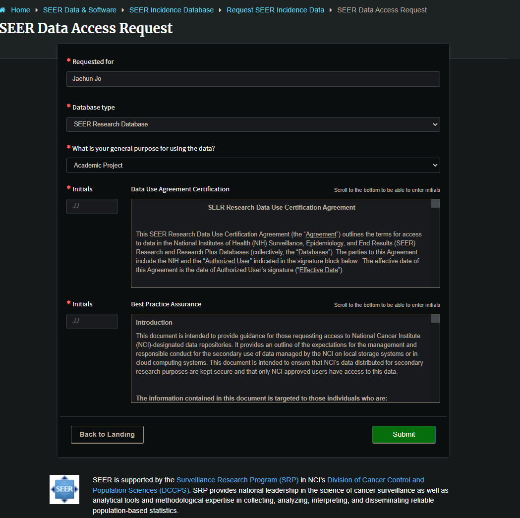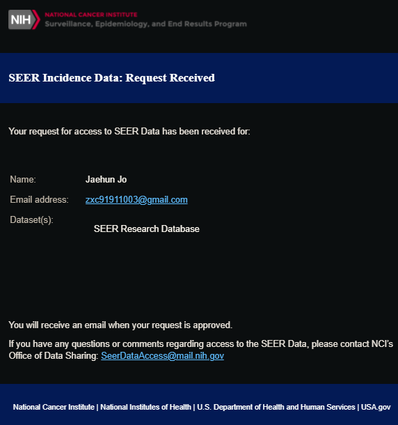 - SEER 데이터 접근 요청 보내기(사이트에서 신청 가능, 요청서 작성 후 제출, 메일 인증 필요)