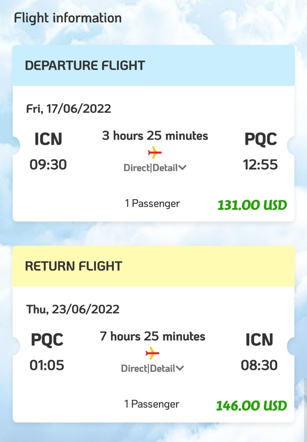 하지만 그 와중에 베트남과 괌은 나름 합리적인 가격 선이라 둘 중에 고민하다가 혼자 가는 여행에 더 알맞다고 생각한 베트남으로 결정. 이전에 다낭&호이안은 가봤어서 호치민/하노이 등을 알아보다가 '푸꾸옥'이 최근 떠오르는 여행지라 하여 가보기로 하였다. 이번 여행 전에는 전혀 들어본 적 없던 곳이었고, 지인들에게 푸꾸옥 간다고 하면 아는 사람이 아무도 없었다. 조만간 더 유명해질듯...