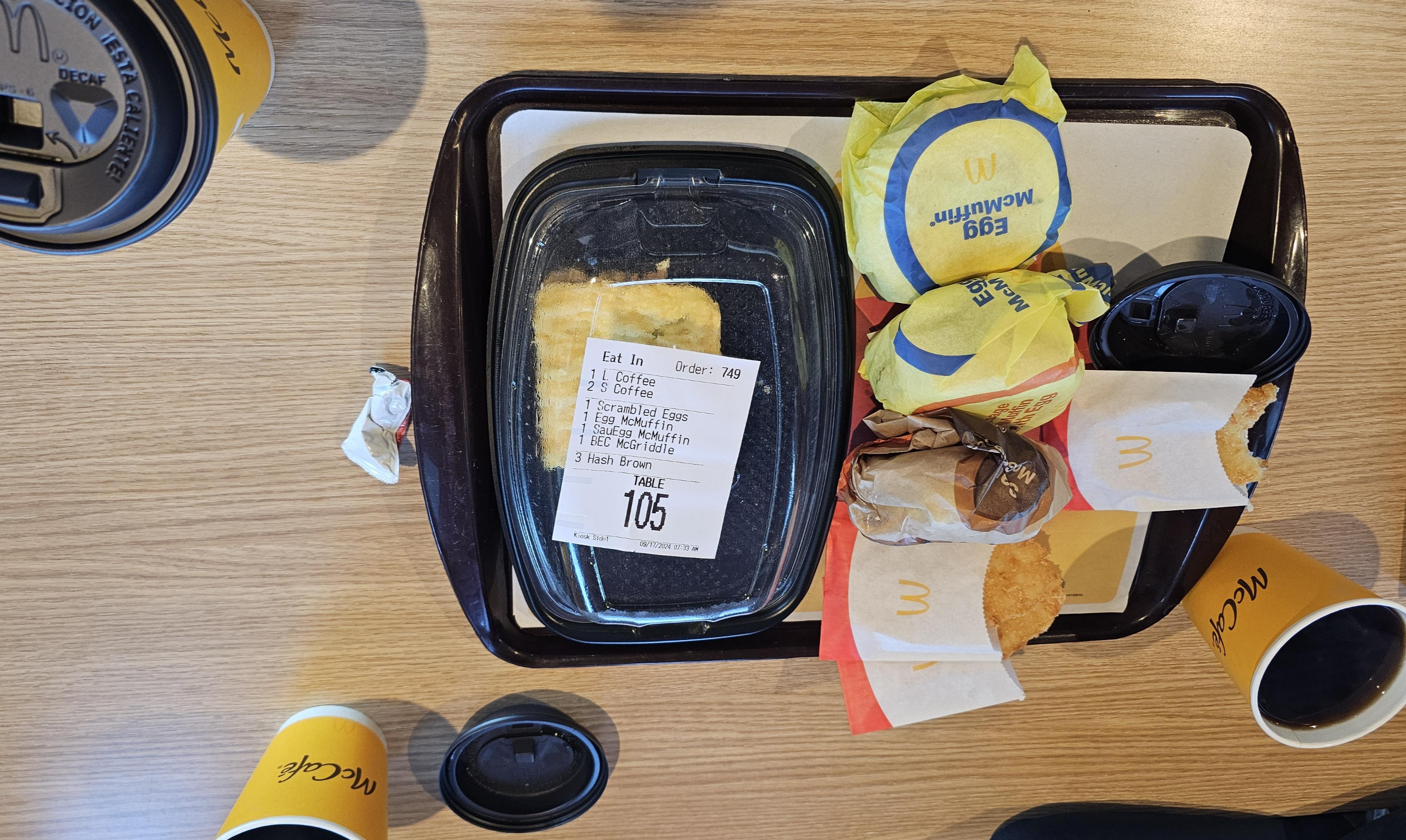 6시 출발 후, 1시간 반 정도를 달리다가 조식을 먹으러 맥모닝에 들렀다.
