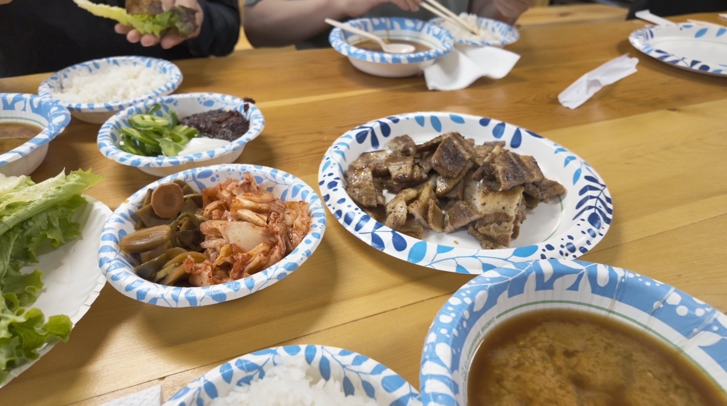 저녁으로 삼겹살이 제공되지만, 추가로 먹을 간식이나 술 등을 사야 한다.