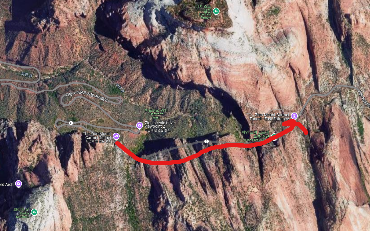 자이언 캐년에서 브라이스 캐년으로 넘어가는 도중 터널 전에 있는 뷰포인트 입니다. 이 길 자체가 자이언 캐년을 오르지 않아도 멋진 광경들을 볼 수 있습니다. 또한 갓길이 넓게 있어서 잠시 차를 세우고 사진을 찍기에도 좋은 곳입니다.