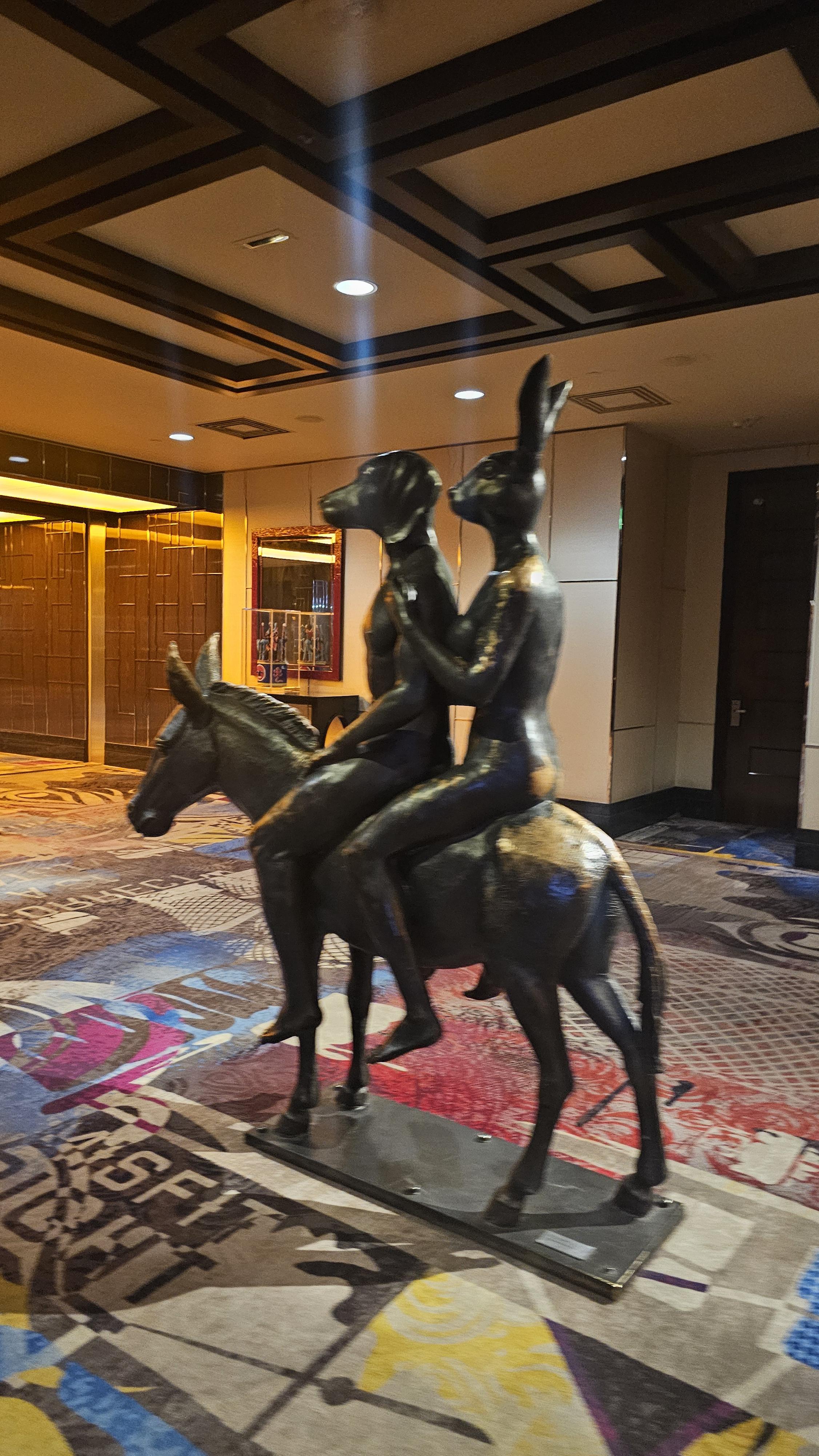 강아지와 토끼가 말을 타고 있는 기이한 동상.