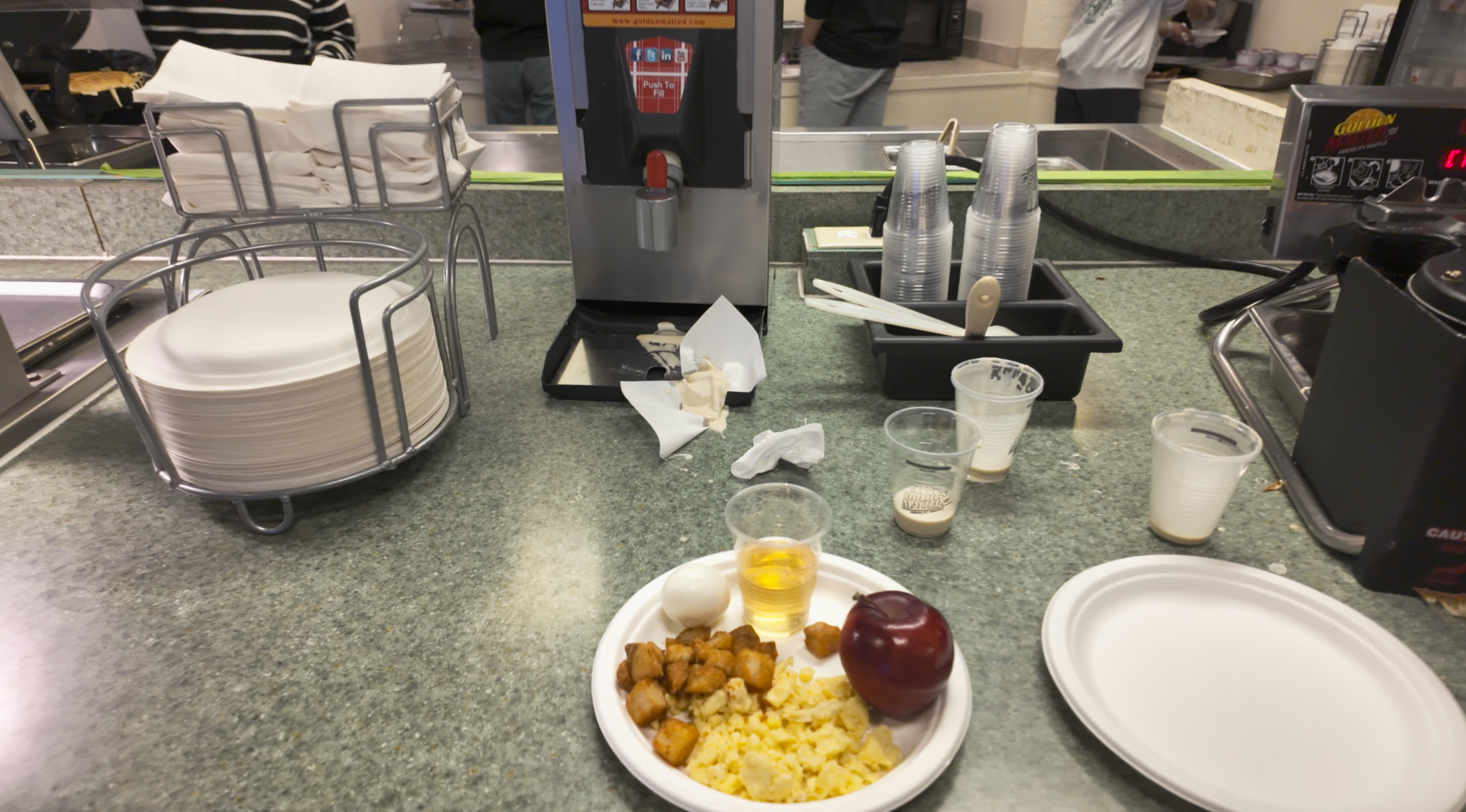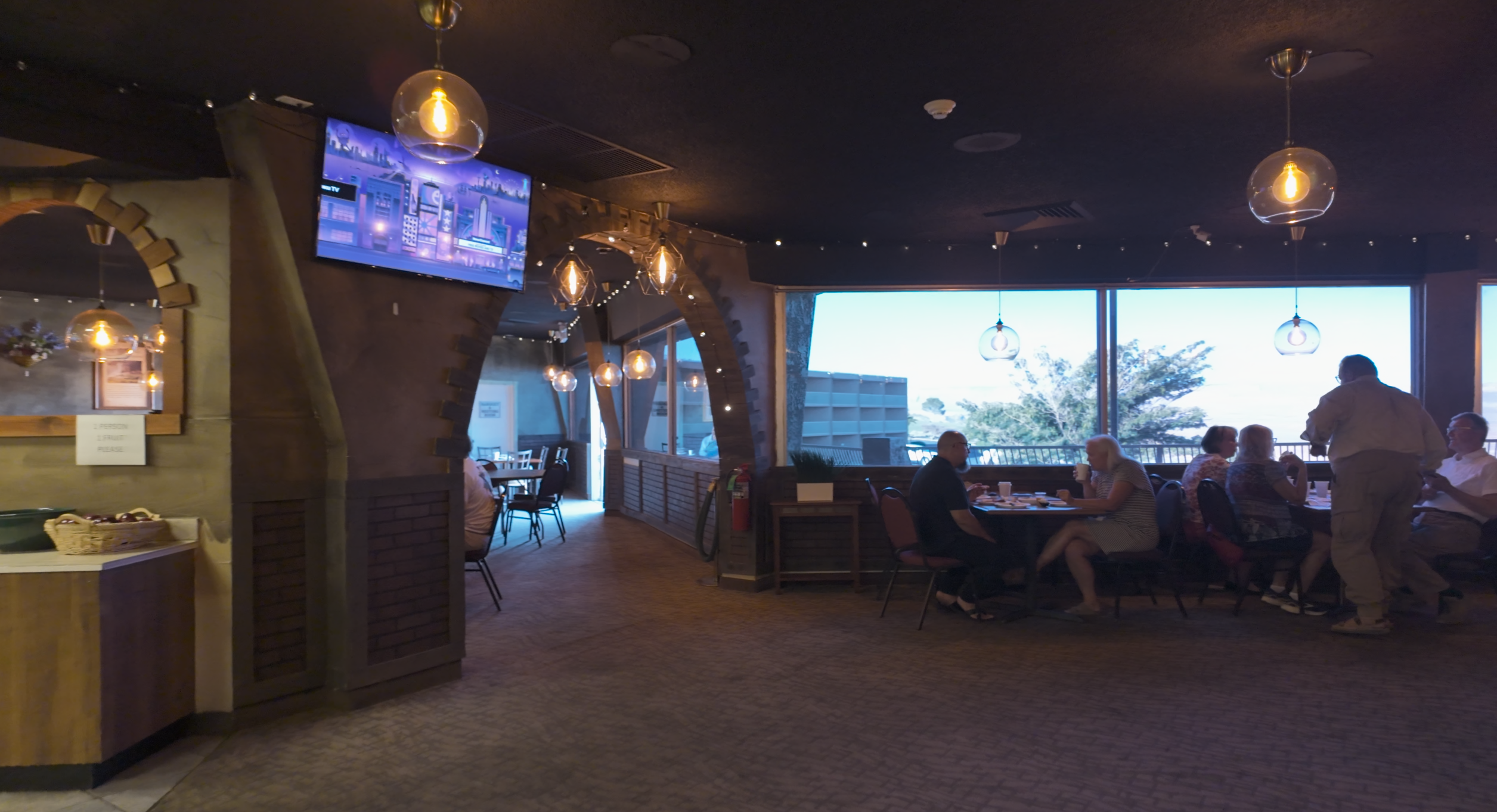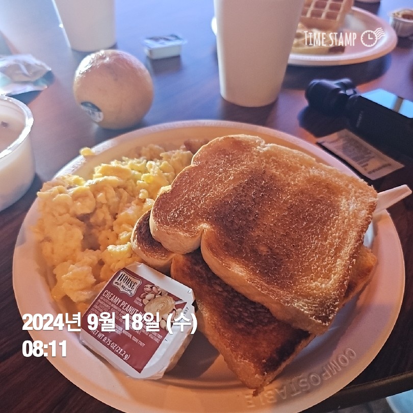 스크램블, 빵, 감자, 과일, 커피, 우유, 시리얼 등을 먹었다. 먹을만한 맛이었고, 배경이 예뻐서 기분좋게 식사할 수 있었다.