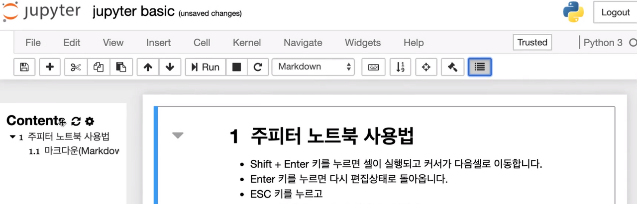 - Shift + Enter : 셀이 실행이 되고 커서가 다음셀로 이동