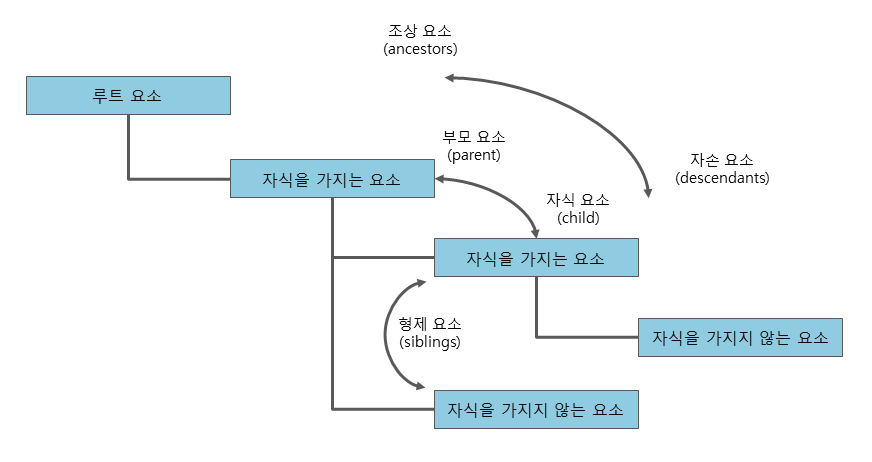 형제(sibling) 요소는 같은 트리 레벨(tree level)에 존재하는 요소를 가리킵니다.
